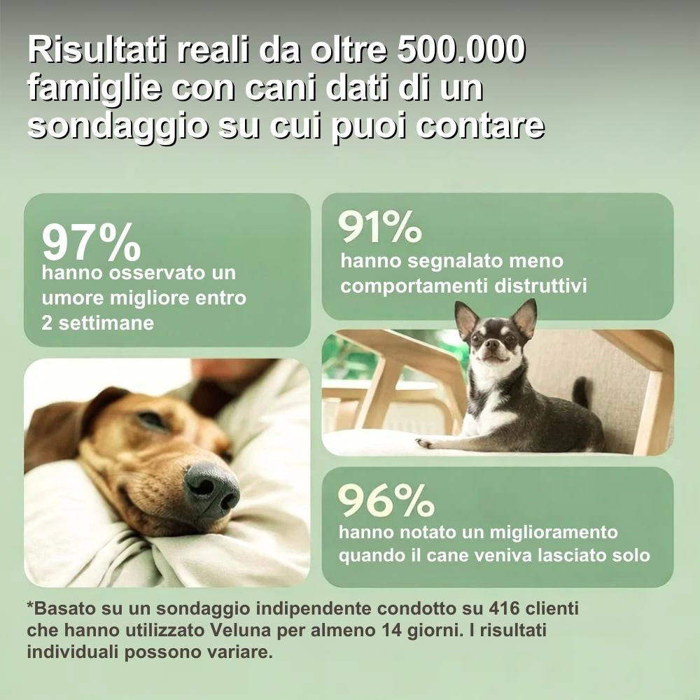 I cani possono iniziare a mostrare segnali di comportamento più tranquillo gradualmente con l’uso continuo. Per il diffusore, i cambiamenti evidenti si osservano in genere entro un periodo fino a 30 giorni, anche se le risposte individuali possono variare.