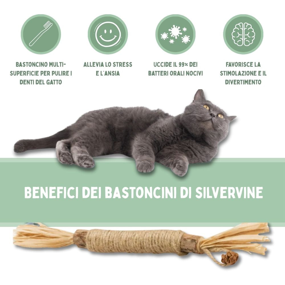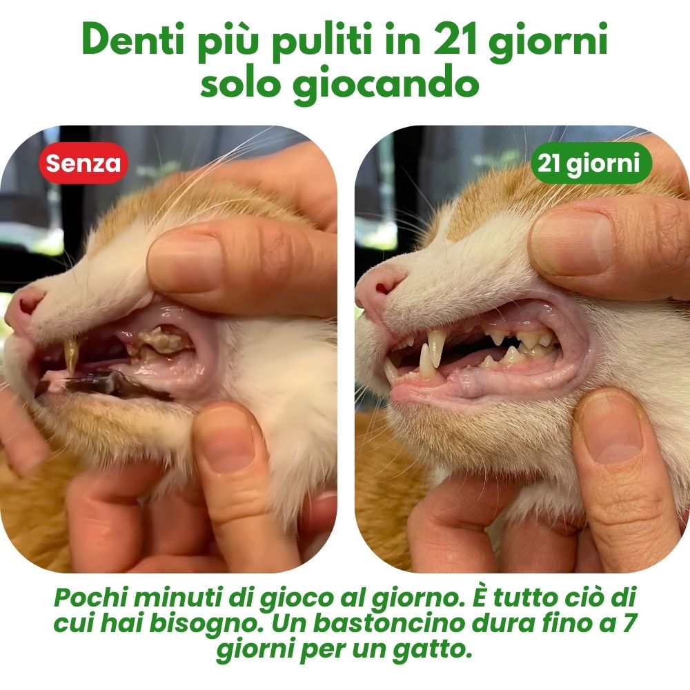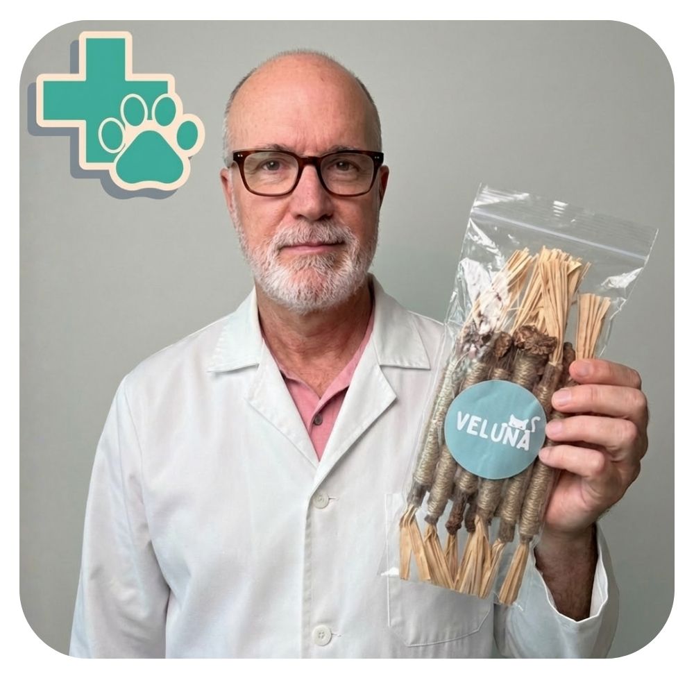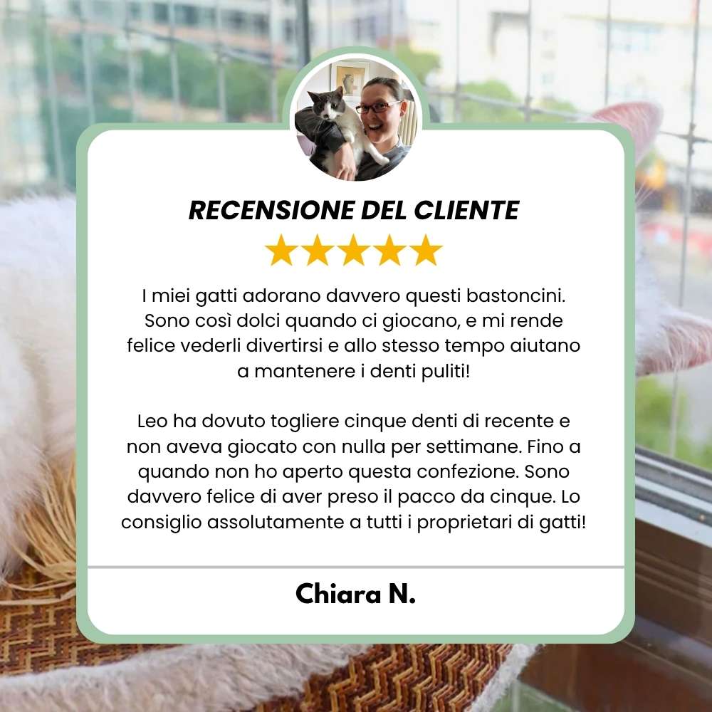 "Nel mio studio raccomando DentaSticks come prevenzione naturale per i problemi dentali. La silvervine è una pianta a cui oltre l'80% dei gatti risponde, a differenza dell'erba gatta dove risponde solo il 30-50%. I gatti puliscono naturalmente i loro denti masticando mentre giocano."